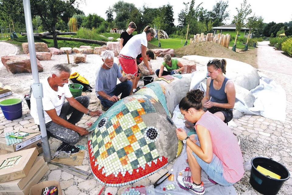 Die Sitzgelegenheit in Form einer Eidechse wurde von den freiwilligen Helfern nun mit bunten Fliesen verziert. Foto: Welker