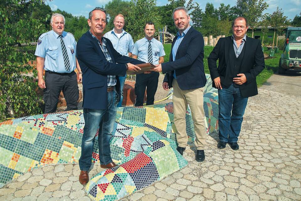 Martin Werner (2.v.l.) und Bürgermeister Maik Brandt (2.v.r.) besiegelten die Zusammenarbeit zwischen der "Phoenix Security Group" und Meckesheim zum Schutz der "alla hopp!"-Anlage. Foto: Alex