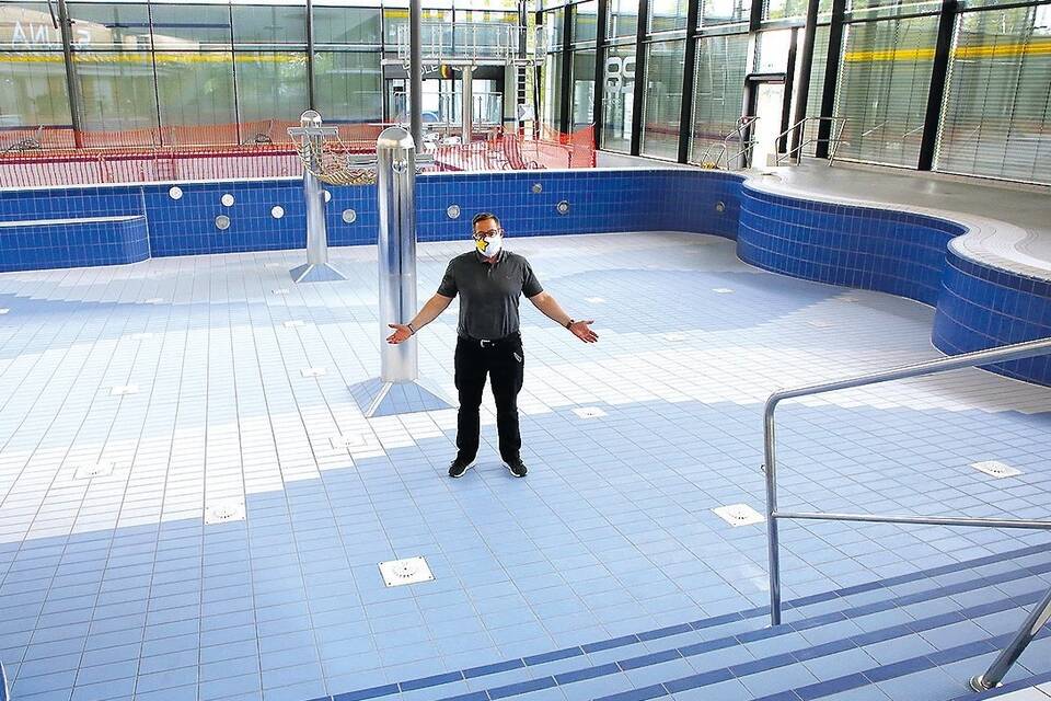 Trist und leer ist das Aqwa-Hallenbad in Walldorf zurzeit. Und Bäderparkleiter Stefan Gottschalk weiß noch überhaupt nicht, wann es wieder öffnen wird. Foto: Pfeifer