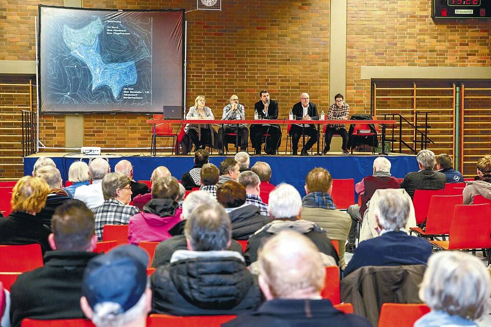 Bei einer Bürgerversammlung informierten die Verantwortlichen rund um Bürgermeister Christoph Oeldorf (Mitte) über die anstehenden Sanierungsmaßnahmen der Johann-Wilhelm-Straße. Foto: Alex