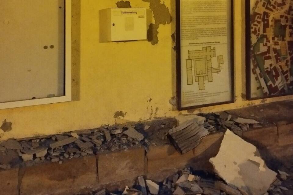 Der Putz brach am Freitagabend großflächig ab. Der Bereich unter dem Balkons musste abgesperrt werden.