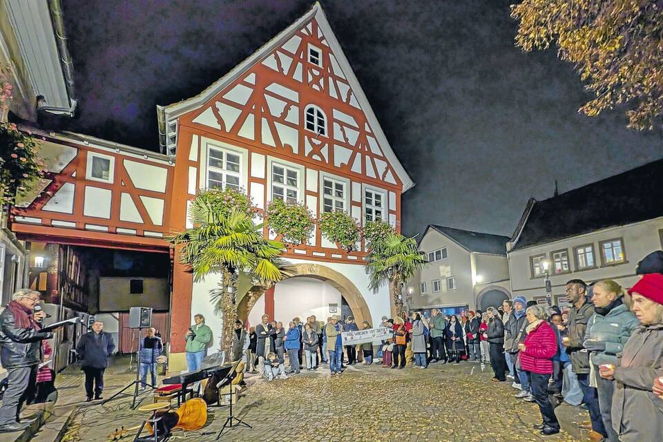 Am 9. November wird bundesweit der Zerstörung von Synagogen vor 87 Jahren gedacht, in Schriesheim war man einen Tag früher, am Samstag, dran. Wohl an die 300 Menschen kamen wie bereits in den beiden Vorjahren ans alte Rathaus – natürlich auch Maier. Die Schätzung stammt von Patrick Schmidt-Kühnle, der 100 Kerzen verteilt hatte, am Ende hatte etwa nur jeder Dritte eine in der Hand. Später wurden die am Stadtbrunnen abgestellt – ein würdiger und feierlicher Anblick.