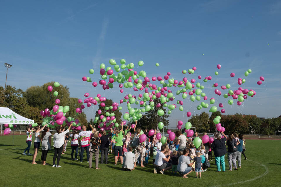 Unter großem Jubel stiegen die grünen und pinken Ballons gestern Vormittag auf dem Sportplatz gen Norden in den Himmel. Foto: Kreutzer