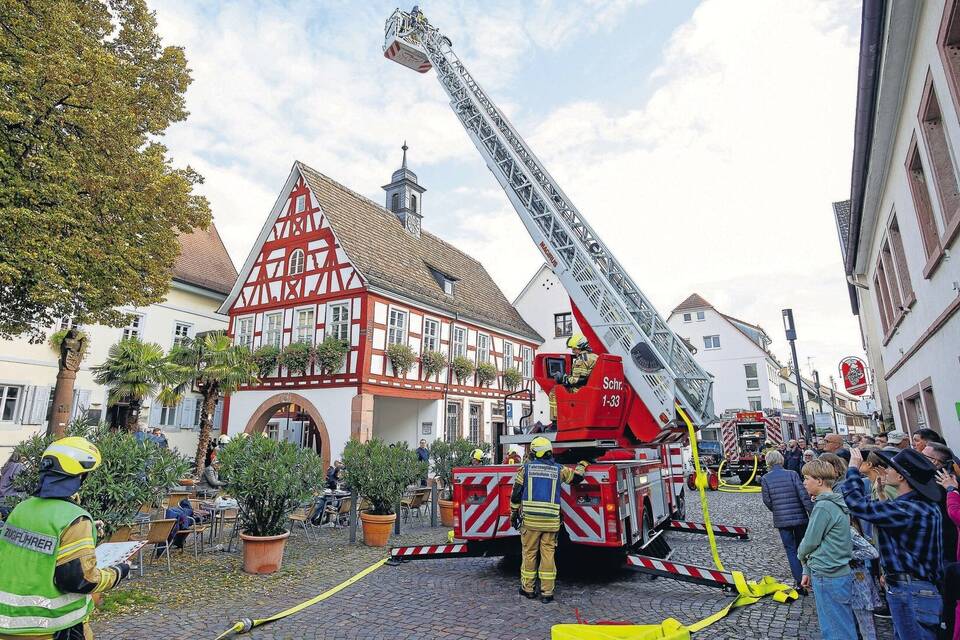 Hauptübung der Feuerwehr am alten Rathaus zog viele Schaulustige an. Höchstes Lob vom Ausbildungsleiter der Mannheimer Kollegen.