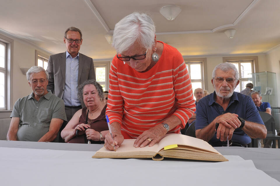 Schriesheim. (fjm) Vor 80 Jahren floh Lore Tobias, geborene Sussmann (2.v.r.), mit ihrer Familie aus Schriesheim vor den Nationalsozialisten in die Vereinigten Staaten. Gestern trug sie sich mit ihrer Familie und Nachfahren der jüdischen Schriesheimer Familie Marx ins Goldene Buch ihrer Heimatstadt ein. "Ich bin froh, hier sein zu dürfen. Dieser Besuch wird die Geschichte meiner Familie fortsetzen, die 1653 hierherkam", schrieb die heute 89-Jährige im Alten Rathaus auf die noch leere Seite. Zuvor hatte die Besuchergruppe den jüdischen Friedhof besichtigt, über Stammbäume und Verbindungen der beiden Familien gesprochen und die Strahlenberger Grundschule besucht, in der die junge Lore Sussmann Repressalien und Angriffen ihrer Mitschüler ausgesetzt war. Heute wird Künstler Gunter Demnig ab 9.30 Uhr einen von elf Stolpersteinen verlegen, der Sussmanns Namen trägt. Auch ihres Onkels Ludwig Oppenheimer wird dann mit einem Stolperstein gedacht: Er bekam 1938 kein Visum für die USA, wurde deportiert und starb im französischen Lager Gurs. Die Gedenkveranstaltung, begleitet von Schriesheimer Schülern und Kirchengemeinden, beginnt in der Römerstraße 15. Foto: Dorn