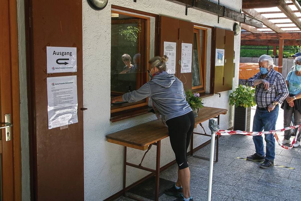 Dem können sich die Vereinsmitglieder, die gestern ehrenamtlich den Betrieb am Laufen halten, nur anschließen: "Es hat uns etwas gefehlt", findet auch Anke Kießling. Während der Andrang letzten Sonntag bei der Eröffnung wegen des schlechten Wetters nicht so gut gewesen sei, läuft er dieses Mal dafür umso besser. Draußen gibt es keine freie Bank mehr, und häufig steht ein Gast auf der anderen Seite der Plexiglasscheibe, um etwas zu bestellen. Der Verkauf läuft nur durch dieses eine Fenster: vor allem belegte Brote und Knabbereien wie Chips oder Kekse. Die Suppen, für die die Schriesheimer Hütte laut Gernold vor allem bekannt sei, sucht man auf der Speisekarte derzeit vergebens, ebenso alles, was zurückgebracht werden muss, wie etwa Speisen auf Tellern. Der reine Kioskbetrieb "ist schon ein bisschen schade", meint Marita Großkopf. Auch die Gäste bedauerten die aktuellen Umstände, akzeptierten sie aber, ergänzt Udo Großkopf.