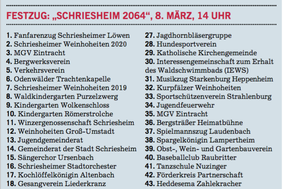 Champions League und Trauben-Energie: Der Festzug hat das Motto "Schriesheim beim Stadtjubiläum 2064"