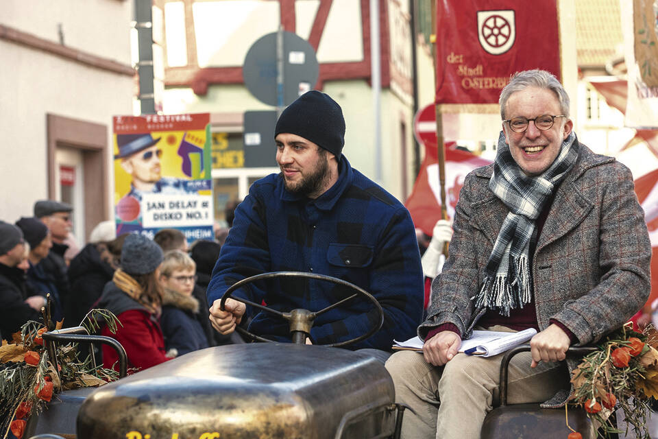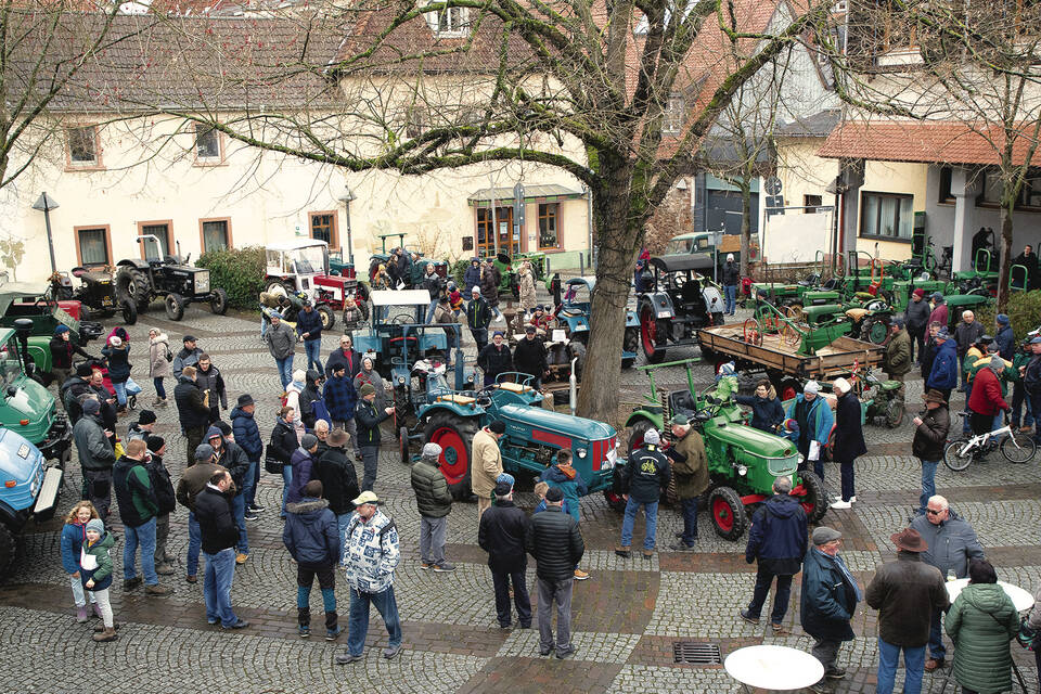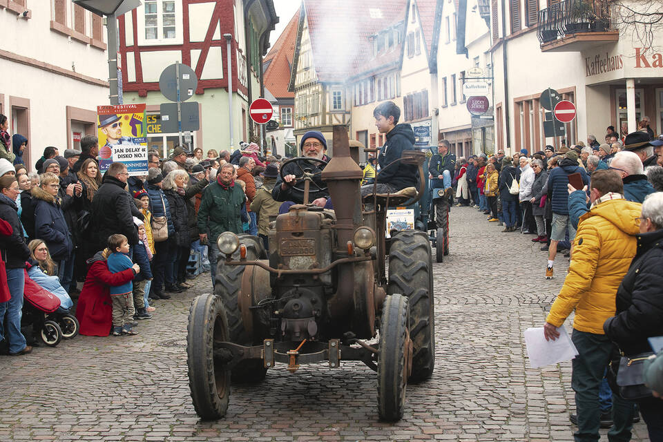 Um 14 Uhr setzte sich der Tross vom Unteren Schulhof aus in Bewegung, am Alten Rathaus kommentierte Peter Grüber, der Organisator des Schleppertreffens (das es erst seit 2016 gibt), die Fahrzeuge, Joachim Müller stellte die Fanfarenzüge vor. Gerade fuhr Richard Schröder aus Großsachsen vorbei: "Das ist der älteste Schlepper heute, Baujahr 1947. Den hat schon sein Vater gekauft. Der müsste so alt sein wie Richard Schröder." Grüber ist froh, dass sich das Wetter beruhigt hat: "Der Odenwald war ja eingeschneit. Ich hätte nicht gedacht, dass so viele doch noch kommen."