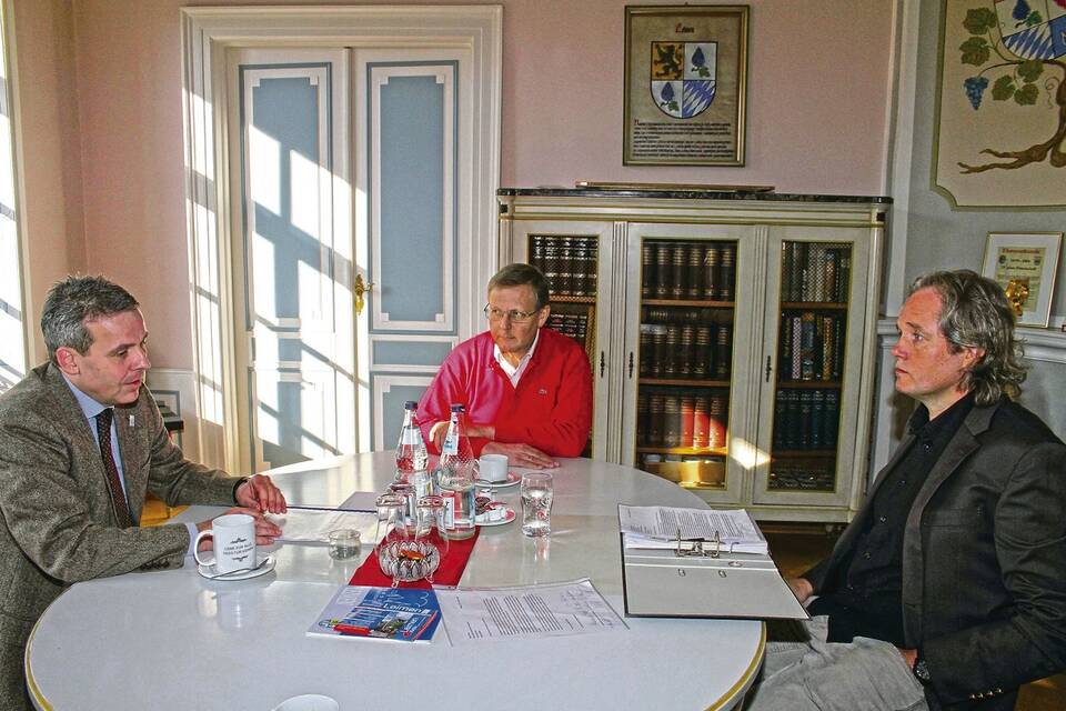 Krisengespräch mit (v.l.) Oberbürgermeister Hans D. Reinwald und Stadtsprecher Michael Ullrich: Bodo Seydler von der Bürgerinitiative für eine verkürzte Baustellendauer auf der L 600 hatte einen Ordner voller Unterschriften mitgebracht. Foto: A. Dorn