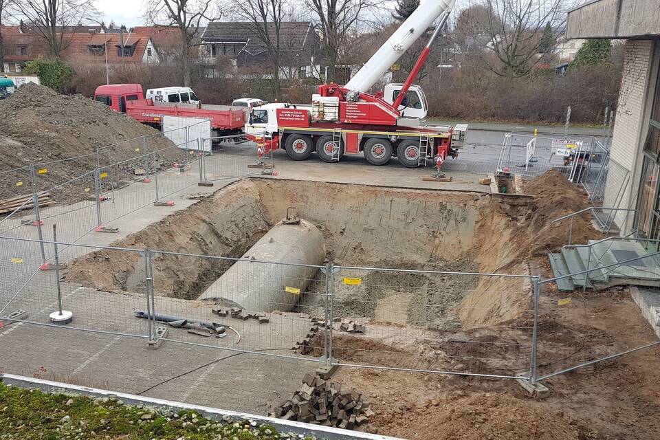 Die tonnenschweren Metallbehälter ließ man damals aber im Boden. Jetzt wurden sie freigegraben und mit einem Lastenkran aus ihrem unterirdischen Aufbewahrungsort herausgehoben. Ein regelrechter Krater erinnert nun an die Tanks. Mit der Bergung war eine Fachfirma beschäftigt, die auch gleich untersuchte, ob die Tanks - etwa wegen eines Lecks - Schadstoffbelastungen im Erdreich verursacht haben könnten. Nach Angaben der Stadt stehen die letzten Ergebnisse der Bodenproben noch aus, fürs Erste habe es aber keine negativen Auffälligkeiten gegeben, so Architekt Baier.