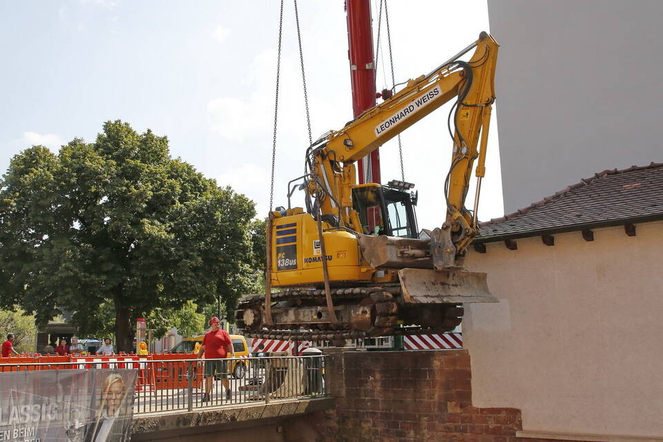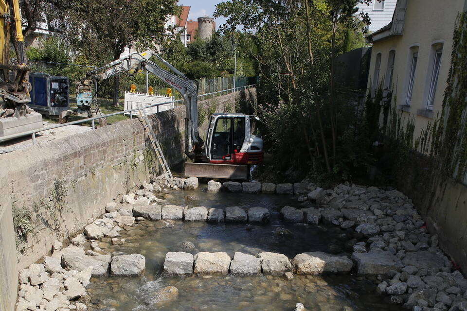 Der Bagger wurde wieder aus dem Bachbett gehoben, nachdem die Maßnahmen des Abwasser- und Hochwasserschutzverbands (AHW) am Leimbach in Wieslochs Innenstadt abgeschlossen waren. Foto: Pfeifer