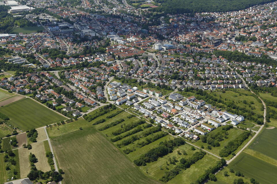 Die Große Kreisstadt Wiesloch aus der Vogelperspektive: im Vordergrund das Neubaugebiet "Äußere Helde", dessen (reduzierter) zweiter Bauabschnitt (auf der Ackerfläche ganz rechts unten) derzeit in der Planung ist. Foto: Pfeifer