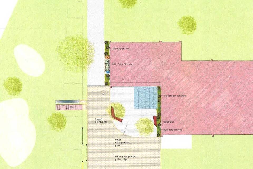 So könnte der neue Hof der Rotenberger Schlossbergschule aussehen: Wichtig für die Schule ist vor allem eine große und ebene Fläche, die durch die neue Betonpflasterung (beige) geschaffen werden soll. Daneben ist ein neuer Eingangsbereich geplant (hellgrau), der vom restlichen Hof mit Steinen und Bepflanzung abgetrennt wird. Grafik: Stadt
