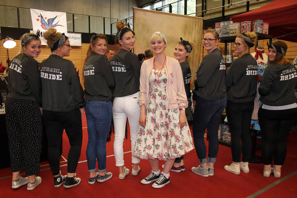 Walldorf. (agdo) Sie sei leider im falschen Jahrzehnt geboren, ein wenig früher wäre besser gewesen, stellte Vanessa mit einem Augenzwinkern fest, denn die junge Frau findet die 50er Jahre einfach toll: angefangen bei der schwungvollen Musik über die schönen Petticoats und die Frisuren bis hin zu den tollen Straßenkreuzern. Deswegen heirate sie auch im Stil der 50er Jahre, erzählte sie, das Hochzeitsauto soll selbstverständlich ein blitzblank polierter Oldtimer sein. Mit einigen Freundinnen feierte Vanessa, die aus Bad Schwalbach kommt, ihren Junggesellinnenabschied beim Rock’n’Roll-Weekender, der über Pfingsten in Walldorf stattfand. Die Mädels ließen es gut krachen.