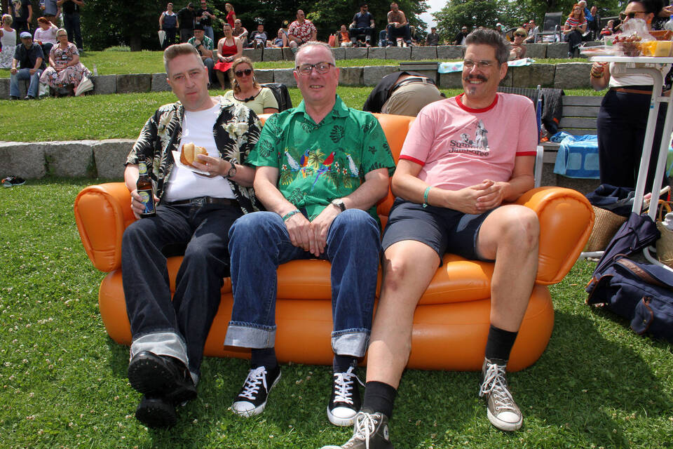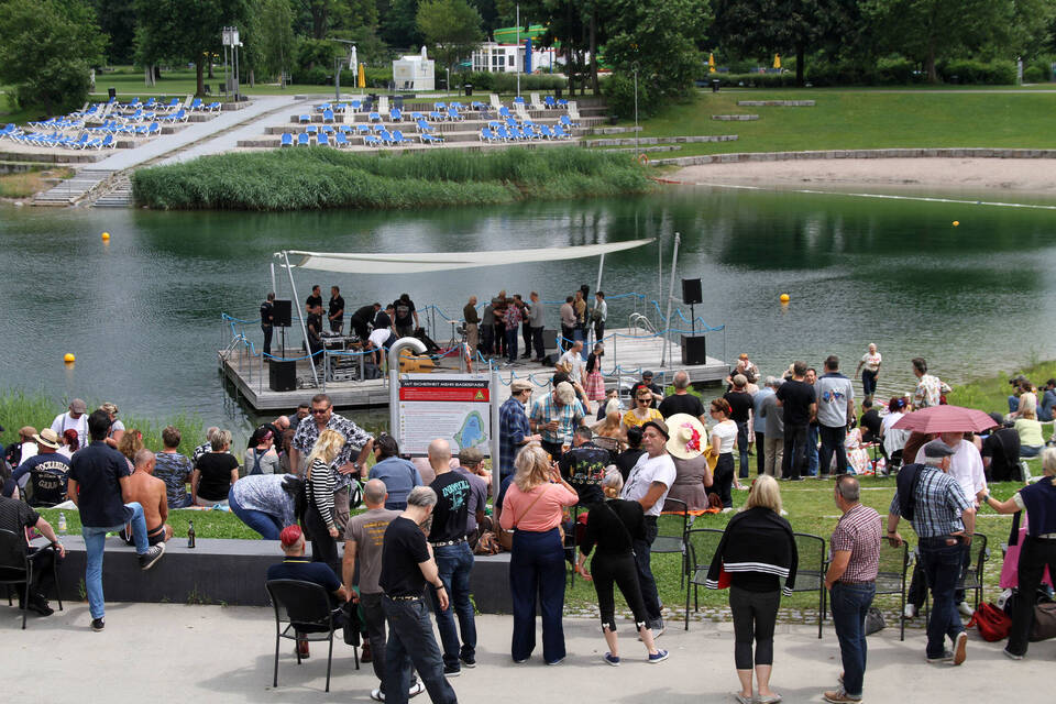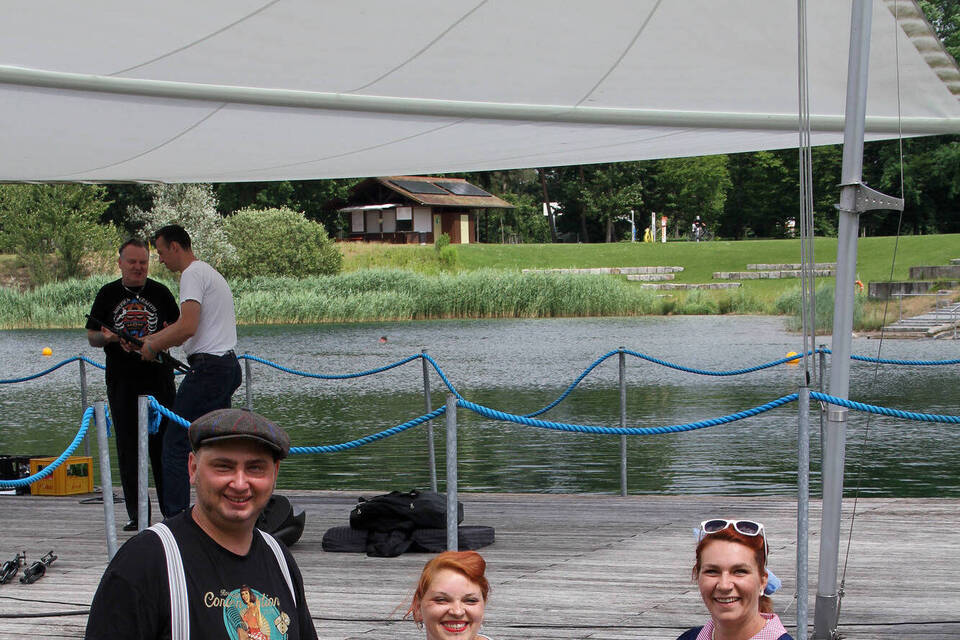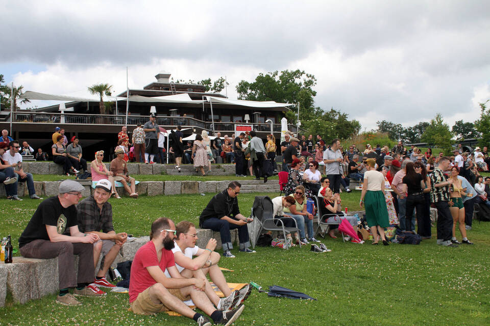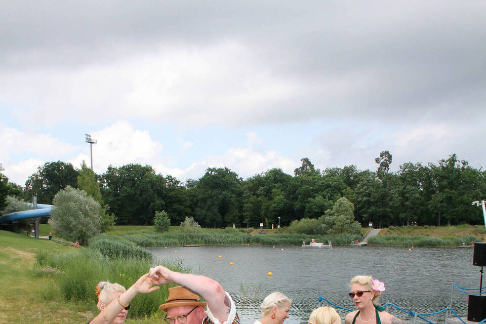 Auf der Seebühne im Aqwa-Bäderpark steppte der Bär, dort traten die Bands "Benny And The Cats" und "P-51 Airplanes" auf, Mädels wie Jungs schwangen zur Rock’n’Roll-Musik ihre Hüften. Wem es vom Tanzen zu heiß wurde, der erfrischte sich anschließend im See. Es lässt sich sagen: Man fühlte sich einfach in eine andere Zeit zurückversetzt. Die Besucher saßen auf Decken oder auf anderen Sitzgelegenheiten und lauschten der Musik. Einige Damen trugen einen Sonnenhut oder spannten kleine Handsonnenschirme auf, die bei Regen kurzum zu Regenschirmen umfunktioniert wurden. Viele Fans der Ära schwangen vor der Seebühne oder dort, wo sie gerade standen, das Tanzbein. Eine Gruppe Männer, die jedes Jahr das Festival besuchen, hatte sogar eine aufblasbare Couch mitgebracht und schaute sich von dort aus gemütlich das Spektakel an.