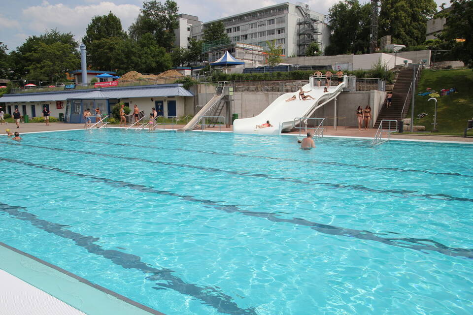 Im Schatten der Baustelle tummelten sich zur Freibad-Öffnung am Samstag einige Besucher im Sportbecken. Während die jungen Gäste die Umstände häufig ausblendeten, ärgerten sich viele ältere Schwimmbad-Besucher über den Zustand der Anlage. Foto: Karoline Beck