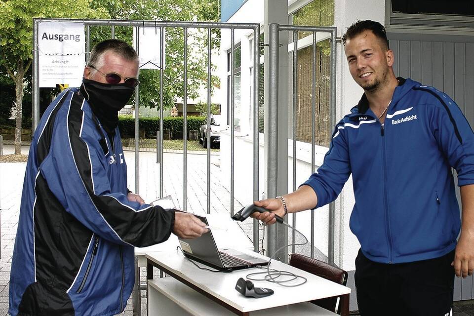 In Gemmingen dürfen nur Gäste (hier Werner Budig, links) mit Saisonkarte ins Imre-Gutyan-Freibad kommen. Die Tickets werden am Ein- und Ausgang vom Personal (hier Sascha Clasen, rechts) gescannt, um immer auf dem Laufenden zu sein, wie viele Besucher sich aktuell im Bad aufhalten. Denn maximal 350 dürfen in diesem Jahr zeitgleich die Freizeitstätte besuchen. Fotos: Falk-Stéphane Dezort