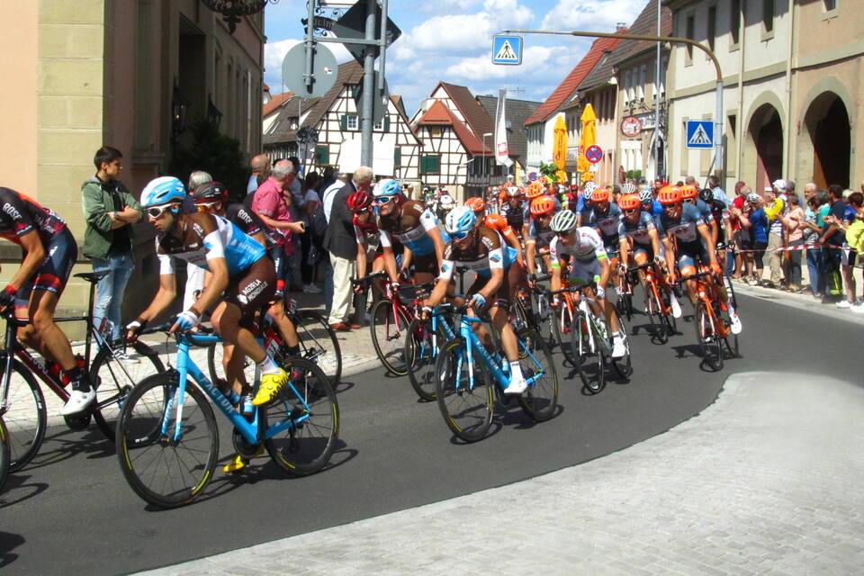 Eppingen. Genau um 14.17 Uhr streift die Deutschland-Tour der Rennradprofis erstmals Eppingen. Wusch, wusch - zwei Fahrer, die sich abgesetzt haben, preschen durch die enge Kurve am Kopf der Altstadt, wo die Bad Rappenauer Straße in die Wilhelmstraße einbiegt. Fünf Minuten später fliegt das Hauptfeld vorbei, nach sieben Minuten streben die Hundertschaften am Straßenrand bereits dem benachbarten Kartoffelmarkt zu.