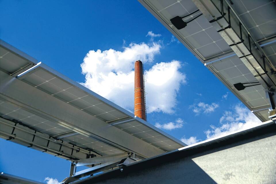 Alt und Neu verbunden: Zwischen den Fotovoltaikmodulen auf der oberen Parkhausebene zeigt sich nach wie vor der markante Schlot des Kesselhauses. Er sollte ursprünglich sogar beleuchtet werden. Dieser Plan wurde aber aus Kostengründen wieder ad acta gelegt. Foto: Armin Guzy