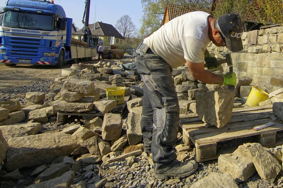 Spezialisten der Firma Hammel aus Bönnigheim rekonstruieren seit Wochen die Stadtmauer. Im Hintergrund beginnen die Arbeiten am unterirdischen Technikraum. Foto: Guzy
