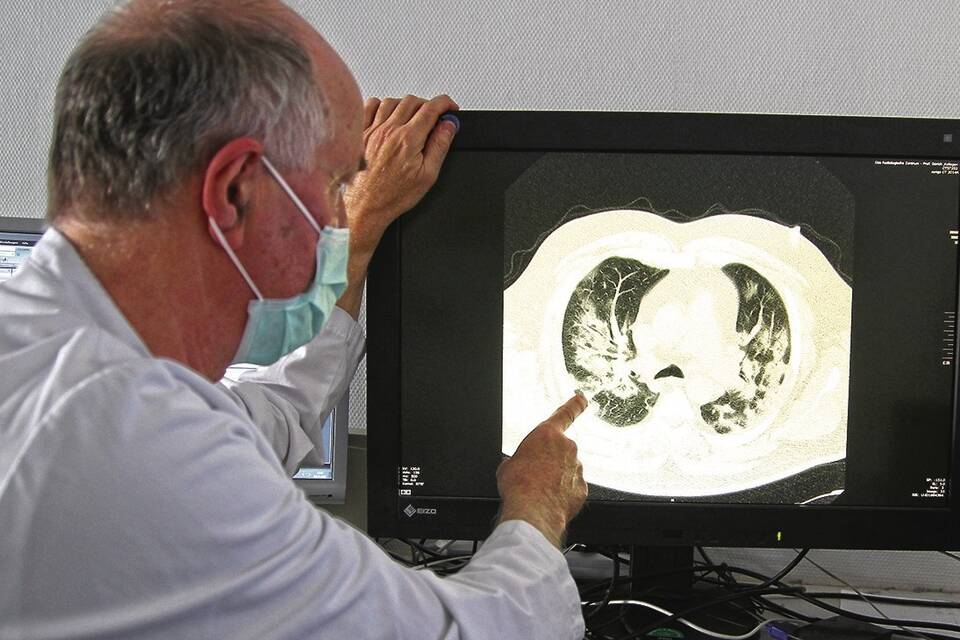 Sieben Beatmungsbetten gibt es im Sinsheimer Krankenhaus. Lässt sich deren Zahl erhöhen? "Wir würden gerne, kommen aber nicht an Beatmungsgeräte heran", erklärt Berentelg. Damit die vorhandenen reichen, sei es enorm wichtig, dass sich alle an die Kontaktbeschränkungen halten, um die Ausbreitung des Virus so gut wie möglich zu verlangsamen, betont Velkopolszky. "Nur das ist der Grund, warum wir die Arbeit hier noch leisten können." Denn was Ärzte mitunter als interessantes Krankheitsbild bezeichnen, kann für Erkrankte tückisch und langwierig sein. "Die Patienten kippen sehr leicht", erklärt Beren-telg. Zudem müssen Covid-Patienten im Schnitt länger beatmet werden als Patienten mit klassischer Lungenentzündung. Ein Blick auf CT-Aufnahmen zeigt das Problem deutlich in Form von vielen weißen Flecken. Dabei handelt es sich um Entzündungsherde in der Lunge.