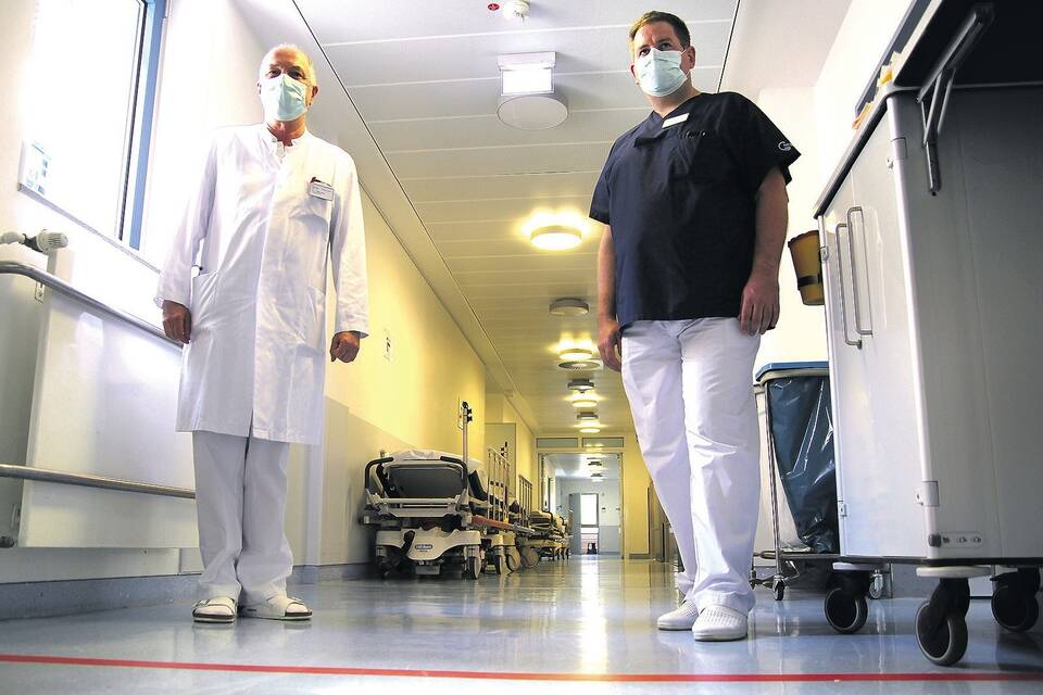 > Wie geht es dem Personal? "Es ist relativ ruhig hier, wir haben die Situation unter Kontrolle", sagt Dr. Vietze. Jeder arbeite professionell. Was niemand sagt, aber vielen anzusehen ist: Das gehört zur Arbeit. Davon gebe es momentan genug. Auch auf den Stationen, die mit Corona nichts zu tun haben. Während andere Kliniken kaum belegt sind und teilweise Kurzarbeit angemeldet haben, sagt Krankenschwester Petra Dittrich, Leiterin der Station 3: "Die Auslastung ist voll, die 50 Betten unserer Station sind belegt." Doch die Beschwerden der Patienten seien schwerwiegender – wer zurzeit ins Krankenhaus geht, kann meist nicht anders. Dementsprechend ist auch der Aufwand für das Personal größer.