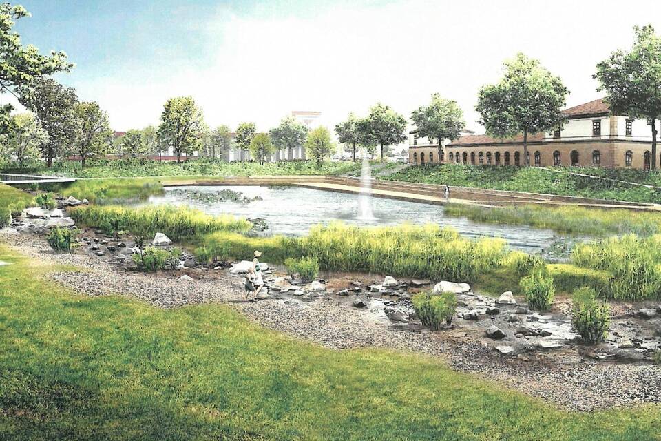 In den Bahnhofswiesen wird ein Stadtweiher entstehen Visualisierung: Planorama/Foto: Guzy