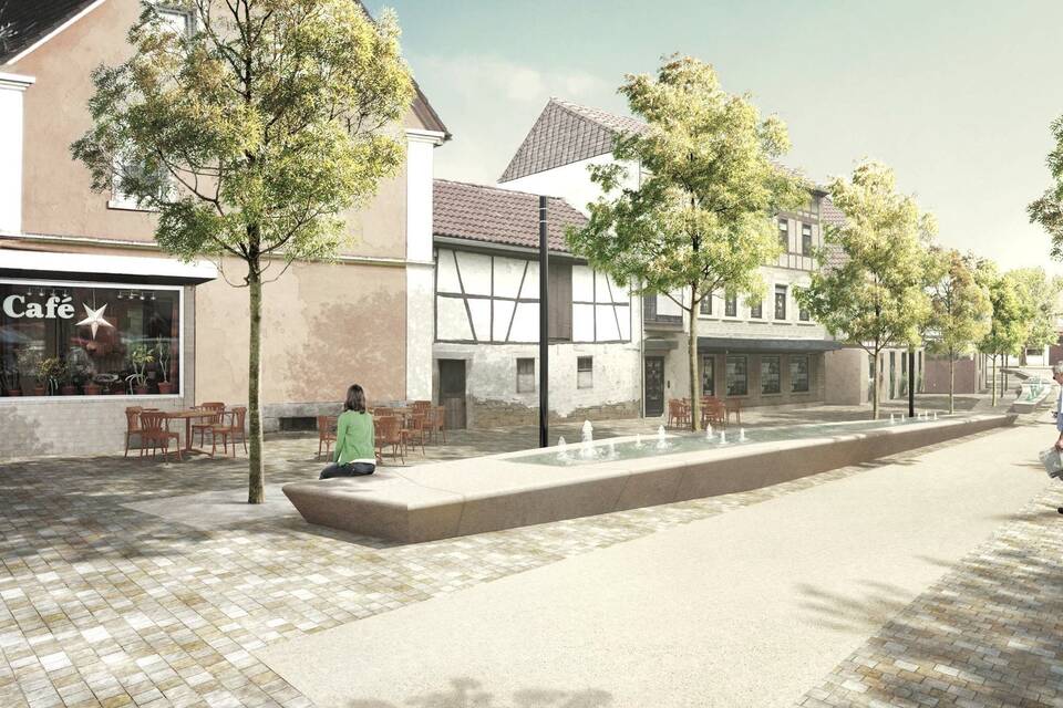 Der längst trockengefallene Mühlkanal wird in einem Ensemble aus 14 Wassertischen reaktiviert. Visualisierung: Planorama/Foto: Guzy