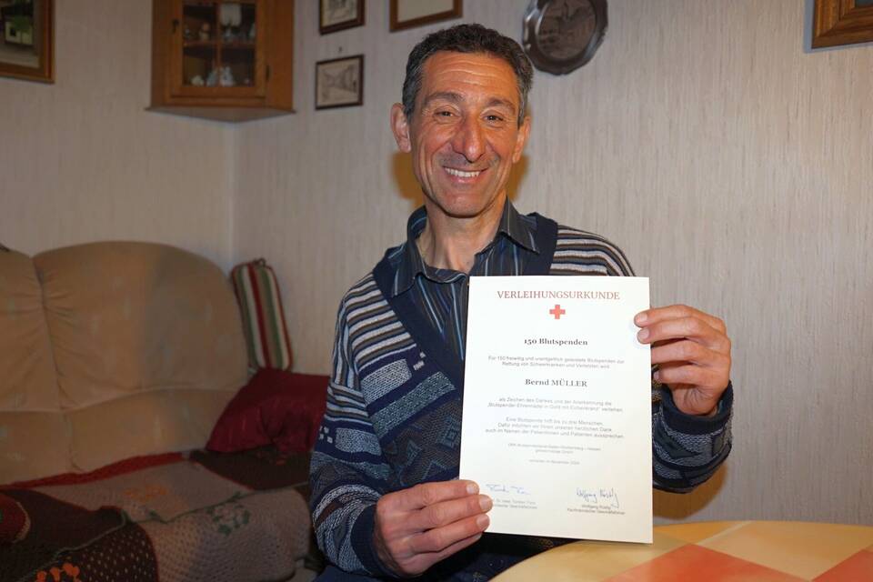 Der 59-jährige Bernd Müller spendet Blut, seit er 18 ist. Er hat die Ehrennadel in Gold mit Eichenkranz für 150 Spenden erhalten