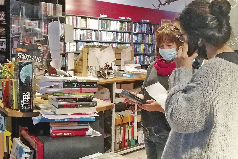 Zumindest nicht vor Carmen Medinis "Bücherland": Die Buchhändlerin und ihre Kollegin sind jetzt der eigene Notdienst, notdürftigst eingerichtet. Im Halbdunkel der weihnachtlich geschmückten Buchhandlung arbeiten sie Berge von Bestellungen ab. Bis zuletzt hatte man gehofft, die Kunden mittels einer Schleuse ohne größeres Infektionsrisiko bedienen zu können.