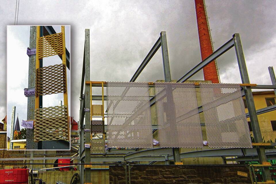 Seit Wochenbeginn sind an der Parkhausbaustelle Musterelemente angebracht, die die Auswahl und den geplanten Sandsteinsockel zeigen. Die Gemeinderäte entschieden sich für die lichtdurchlässigsten Streckmetallgitter und den Farbton "Mittel" (Detailansicht). Fotos: Guzy