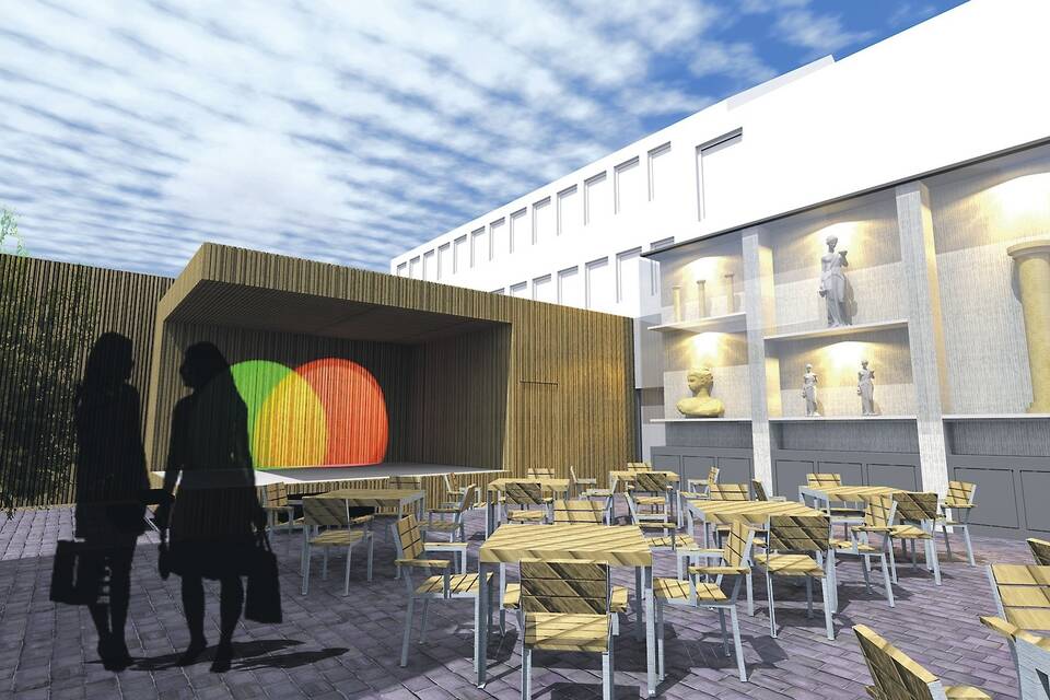 Eine gläserne Scheibe soll sie künftig vor äußeren Einflüssen schützen. Mittig, auf einer Freifläche, sind schlichte Designer-Sitzmöbel eingezeichnet, das eine Mal ähnlich einer Open-Air-Kino-Situation, dann flockig gruppiert mit Tischen: Die "Piazetta" soll später für Veranstaltungen, für die Bewirtung einer höherwertigen Gastronomie im "Drei Könige" - oder für beides - genutzt werden.