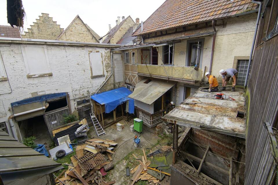 Schweißtreibende Handarbeit ist beim Abbruch einiger Gebäudeteile im Innenhof gefragt. Links sind die Überbleibsel des ehemaligen Kinos zu sehen, dessen Dach schon vor Jahren aus Sicherheitsgründen abgerissen werden musste. Fotos: Armin Guzy
