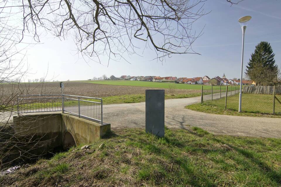 An dieser Stelle wird sich das Gesicht des Dorfes wohl bald deutlich wandeln. Der bis hierher verdolte Bach wird auf 300 Meter Länge aus seinem Betonkorsett befreit und renaturiert. Aus den Äckern gegenüber wird ein Baugebiet mit 41 Grundstücken. Foto: Guzy