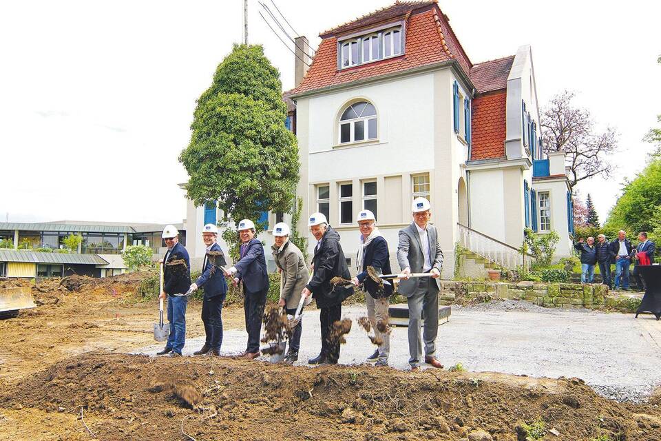 Spatenstich für ein Hotel, das dem Kurhügel ein anderes Gesicht geben wird. Der Neubau wird an die denkmalgeschützte Villa Botsch (hinten) angedockt und über einen Gang mit dem Solebad Rappsodie (links) verbunden. Foto: Guzy