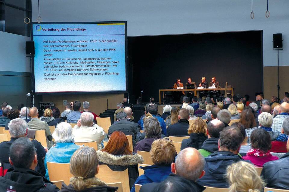 Etwa 350 Besucher informierten sich in der neuen Carl-Orff-Sporthalle zum Thema Flüchtlingsunterbringung. Foto: Kegel
