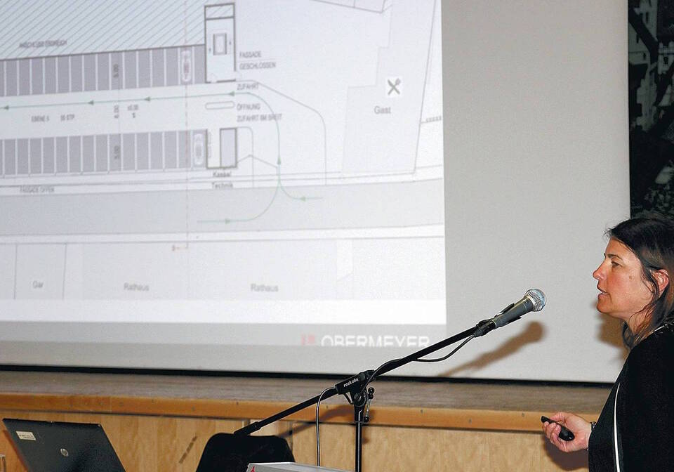 Projektplanerin Nicole Oberberger vom Büro Obermeyer aus Karlsruhe erläuterte auf der Bürgerversammlung die drei möglichen Varianten eines Parkhauses auf dem Süßmostareal. Foto: Brötzmann