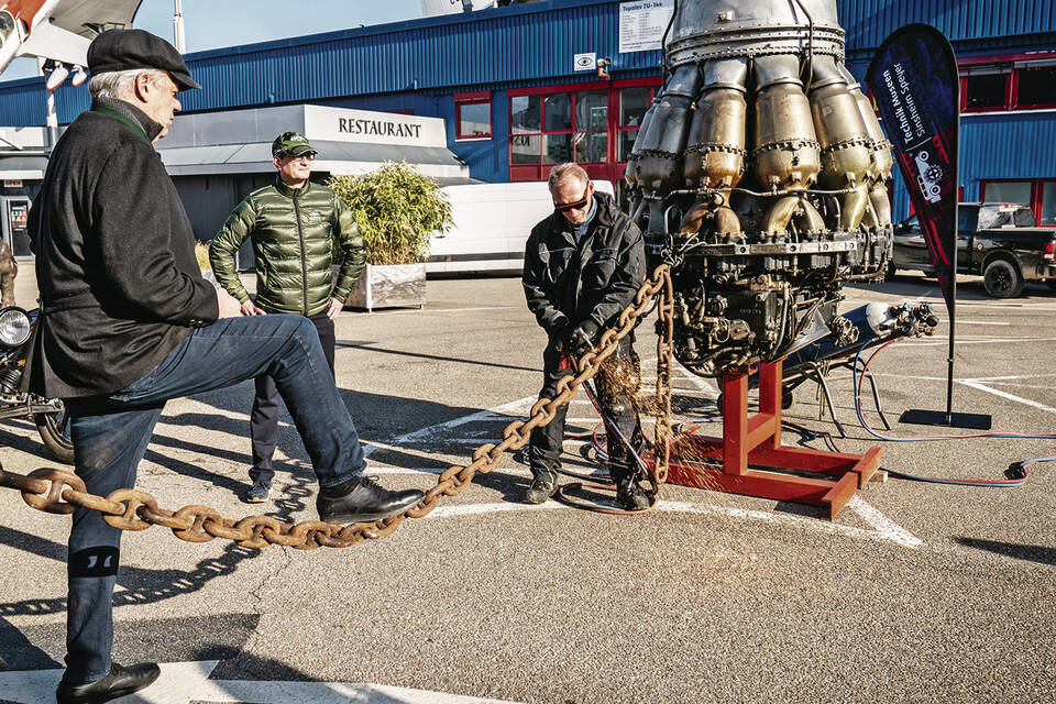 Kurz danach sprengte das Museumsteam symbolisch die Corona-Kette. Zwischen zwei Turbinen angebracht, war die knapp 200 Kilogramm schwere Metallkette mit dem Schneidbrenner in zehn Sekunden durchtrennt. Anschließend fuhr noch ein Oldtimer, ein Ford T von 1924, darüber. "Sicher ist sicher", sagte der Museumspräsident und lachte dabei.
