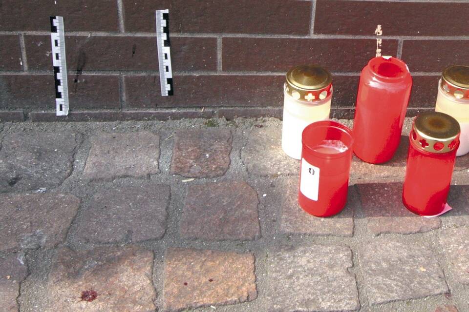 Die kleinen Zollstöcke weisen auf Blutspritzer, die Kerzen gedenken des Opfers. Foto: Frenzel