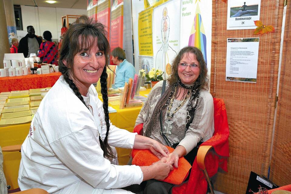 Viele regionale Aussteller waren vertreten, etwa Barbara Eberle (l.), die Ursula Armbruster mit einer Handmassage verwöhnte. Foto: Geschwill
