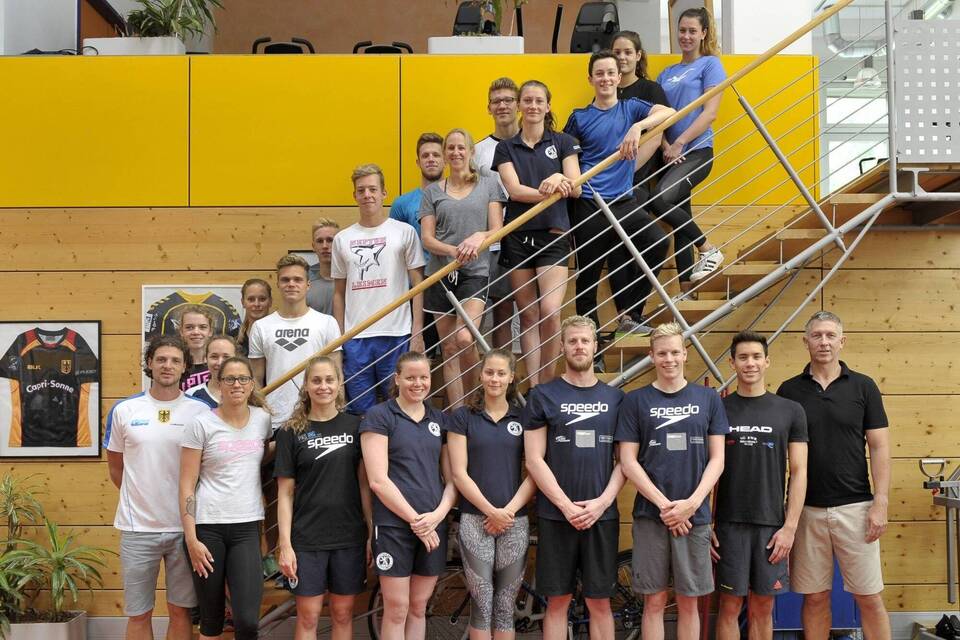 Mit diesem Aufgebot nimmt der Stützpunkt Heidelberg an den deutschen Schwimm-Meisterschaften teil. Vorne v.l.: Stützpunkttrainer Sander Ganzevles, Maike Jung, Sarah Köhler, Selina Hocke, Julia Hassler, Lil Zyprian, Clemens Rapp, Felix Ziemann, Kevin Wedel, Landestrainer Dr.Michael Spikermann. Hinten v.l.: Zoe Vogelmann, Martina van Berkel, Oliver Tabor, Noah Beetz, Torsten Rau, Philip Heintz, Juniorentrainerin Uta Brandl, Paul Reither, Nina Kost, Tim Kost, Judith Baumeister und Tebea Mose. Foto: vaf